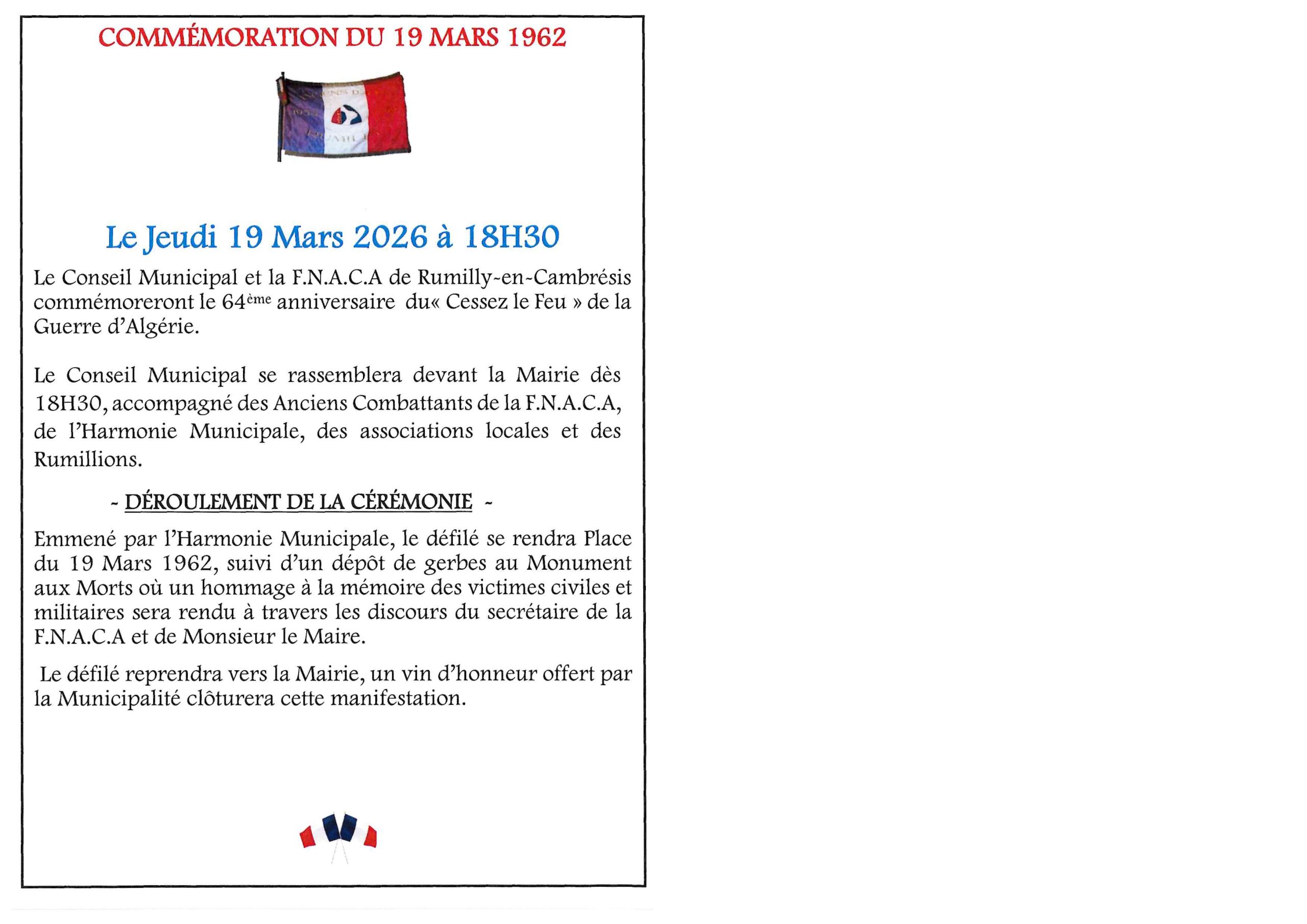Le Conseil Municipal et la F.N.A.C.A de Rumilly-en-Cambrésis commémoreront le 64ème anniversaire du« Cessez le Feu » de la Guerre d’Algérie.